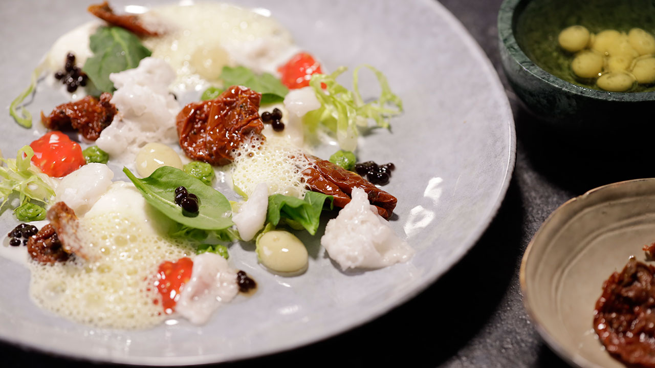 Ensalada de mozzarella con aire de albahaca y agua de tomate gelatinizada