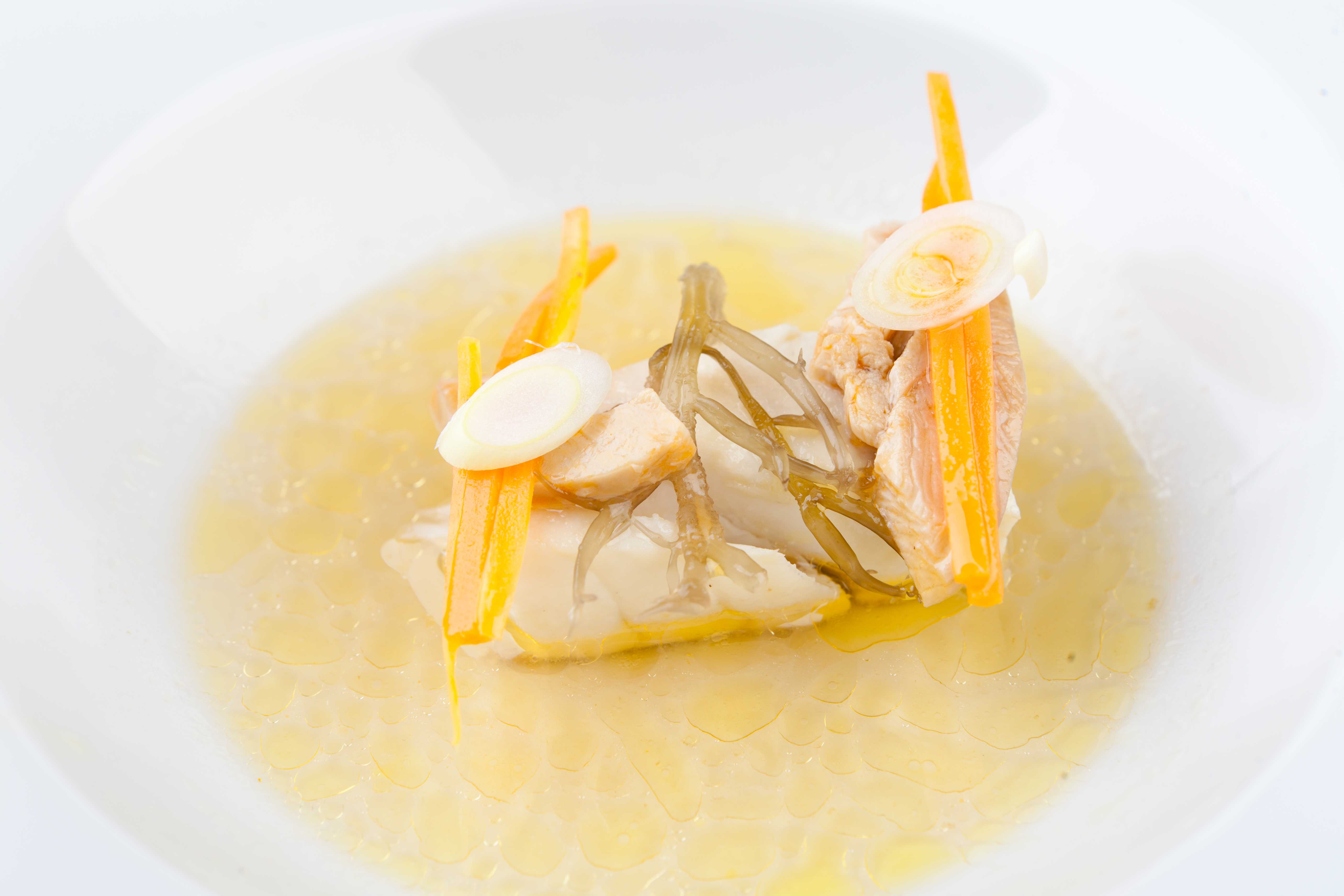 En el aceite confitamos la cebolleta, los ajos y las zanahorias junto con una hoja de laurel, un poco de sal y la pimienta en grano.