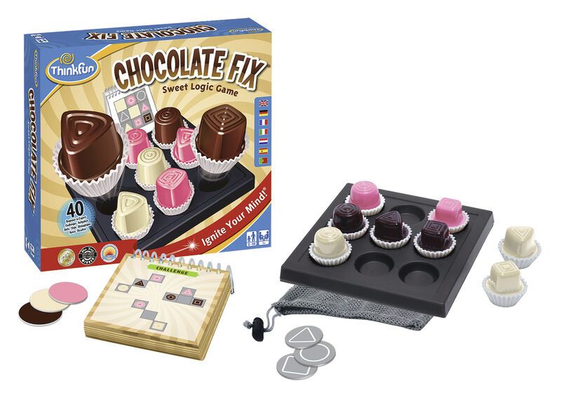 Modelo de juego similar al sudoku «Usando las pistas, llena la bandeja con los nueve bombones en su posición correcta. Al igual que en sudoku, debes examinar todas las pistas del reto antes de hacer ningún movimiento. Descarta las posibilidades para rellenar cada surtido, agudizando tus razonamientos.» Potencia el razonamiento deductivo «Contenido: Bandeja para bombones, 40 nuevos retos, 9 «»bombones»», 18 marcadores de posición con solor y forma, bolsa de viaje»