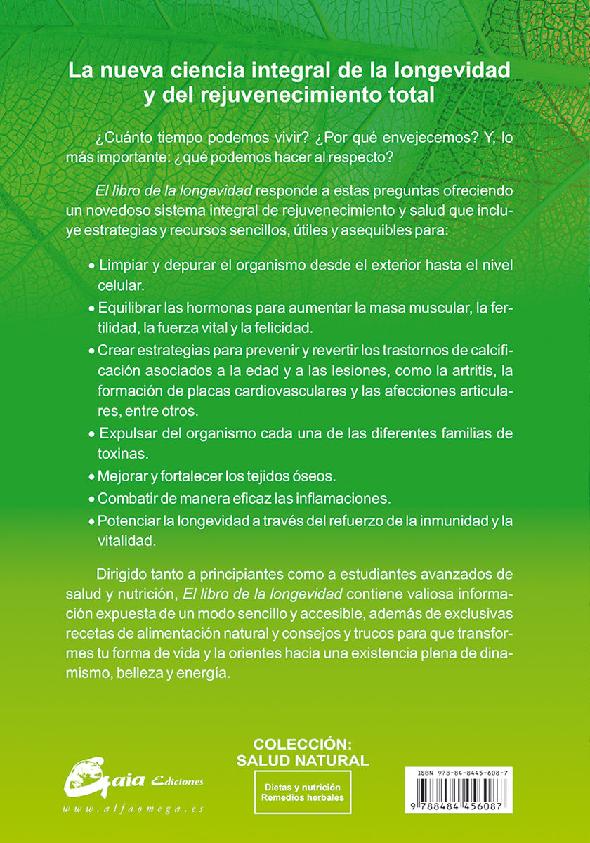 El libro de la longevidad responde a estas preguntas ofreciendo un novedoso sistema integral de rejuvenecimiento y salud que incluye estrategias y recursos sencillos, útiles y asequibles para: