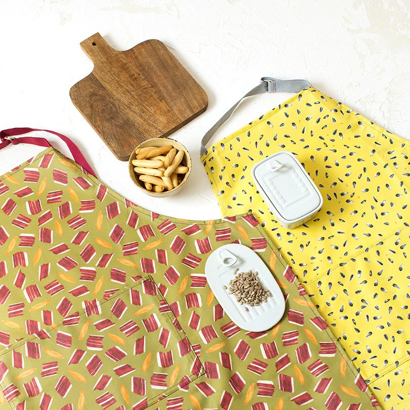 Delantal estampado con pipas de girasol, porque cuando estás fuera te das cuenta que en la mayoría de países las pipas son alimento de pájaros. Confeccionado en algodón 100% con una capa de resinado infalible repeliendo manchas.