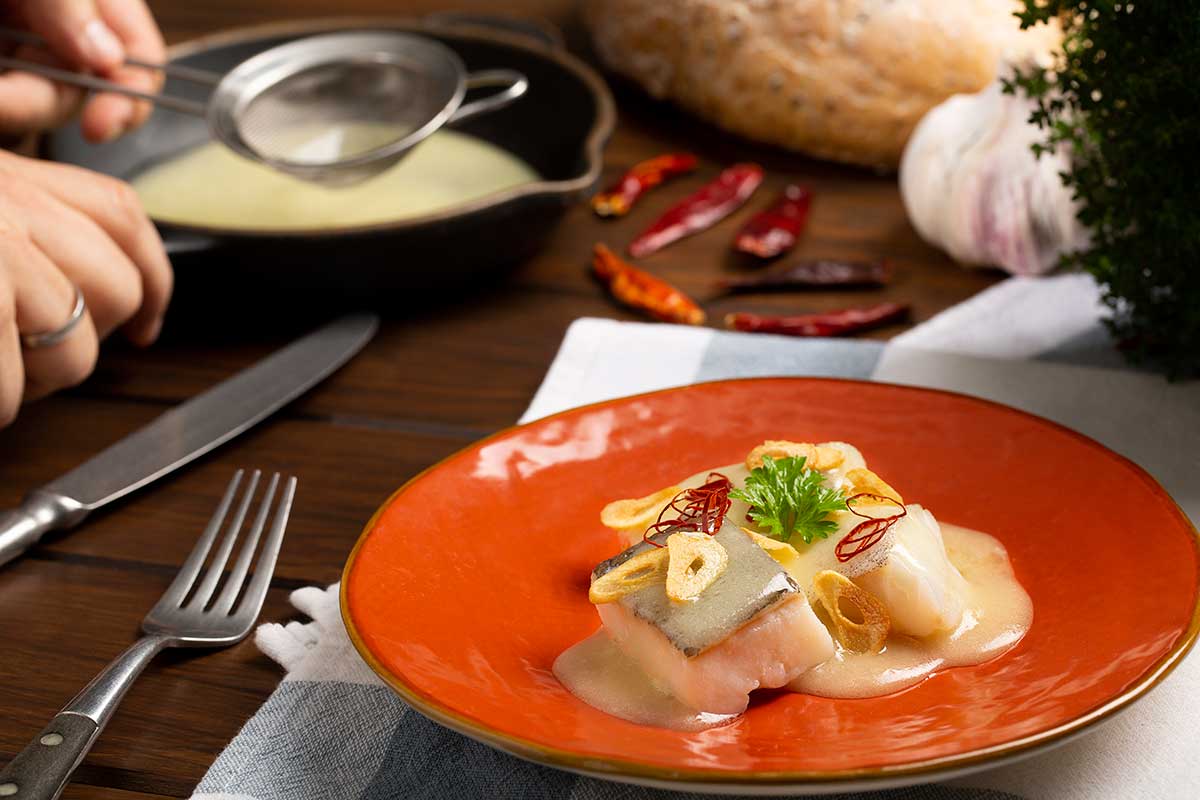 el pintxo tradicional de la receta de kokotxas de bacalao al pil pil se suele servir en una cazuela de barro que es la manera de conseguir la emulsión del aceite con la gelatina del bacalao
